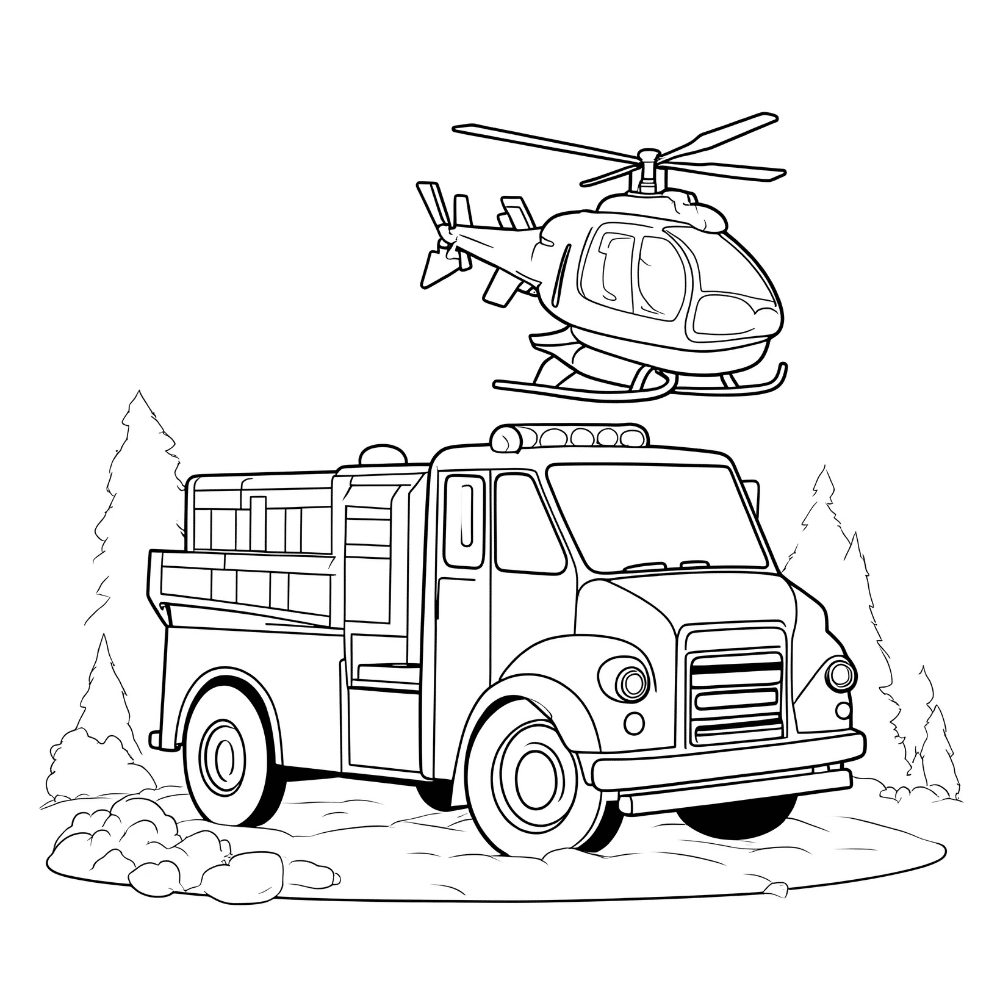 Watch this amazing team – a fire truck and helicopter working together! Which one will you color first?