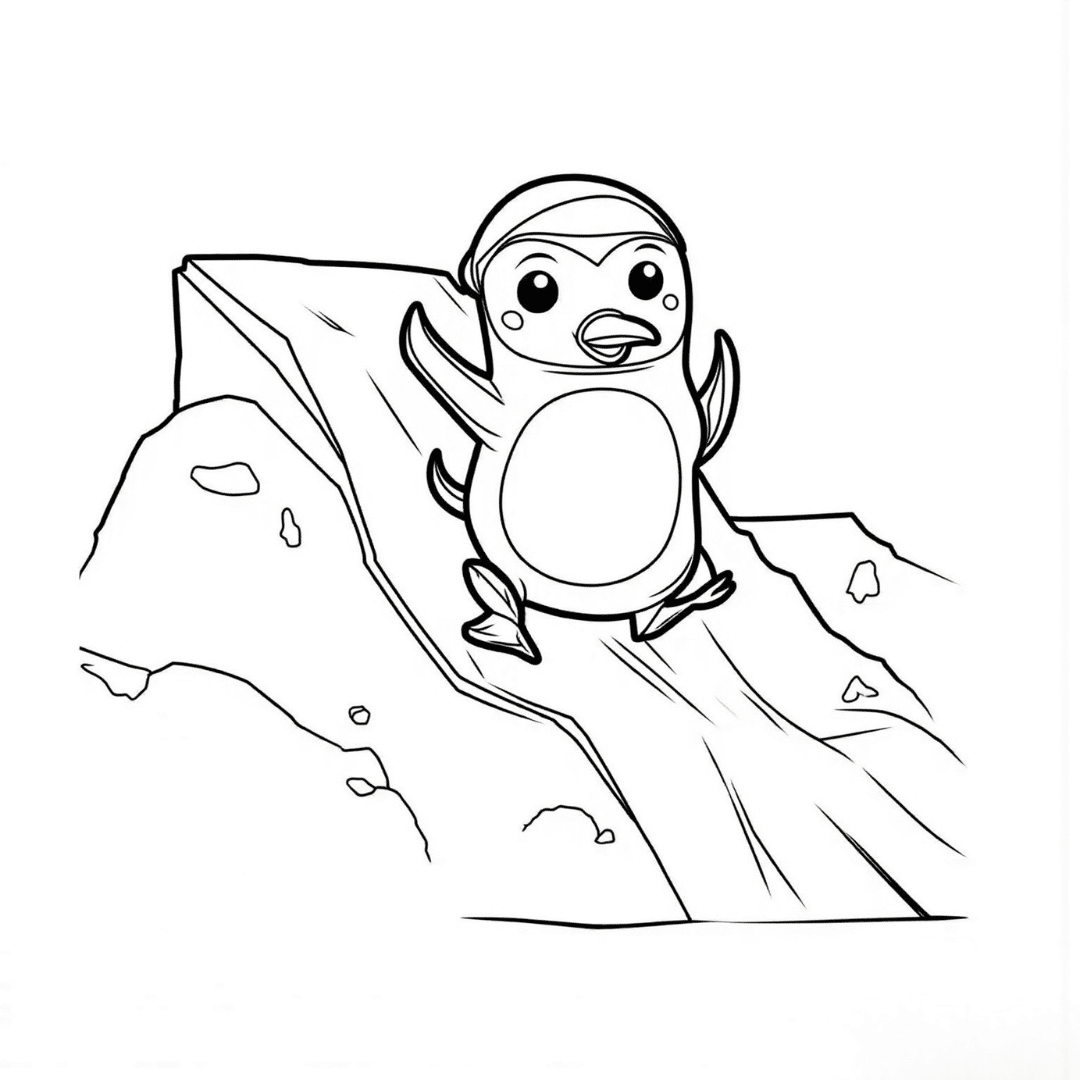 A playful penguin sliding down an icy slope, with a joyful expression and snow surrounding it.