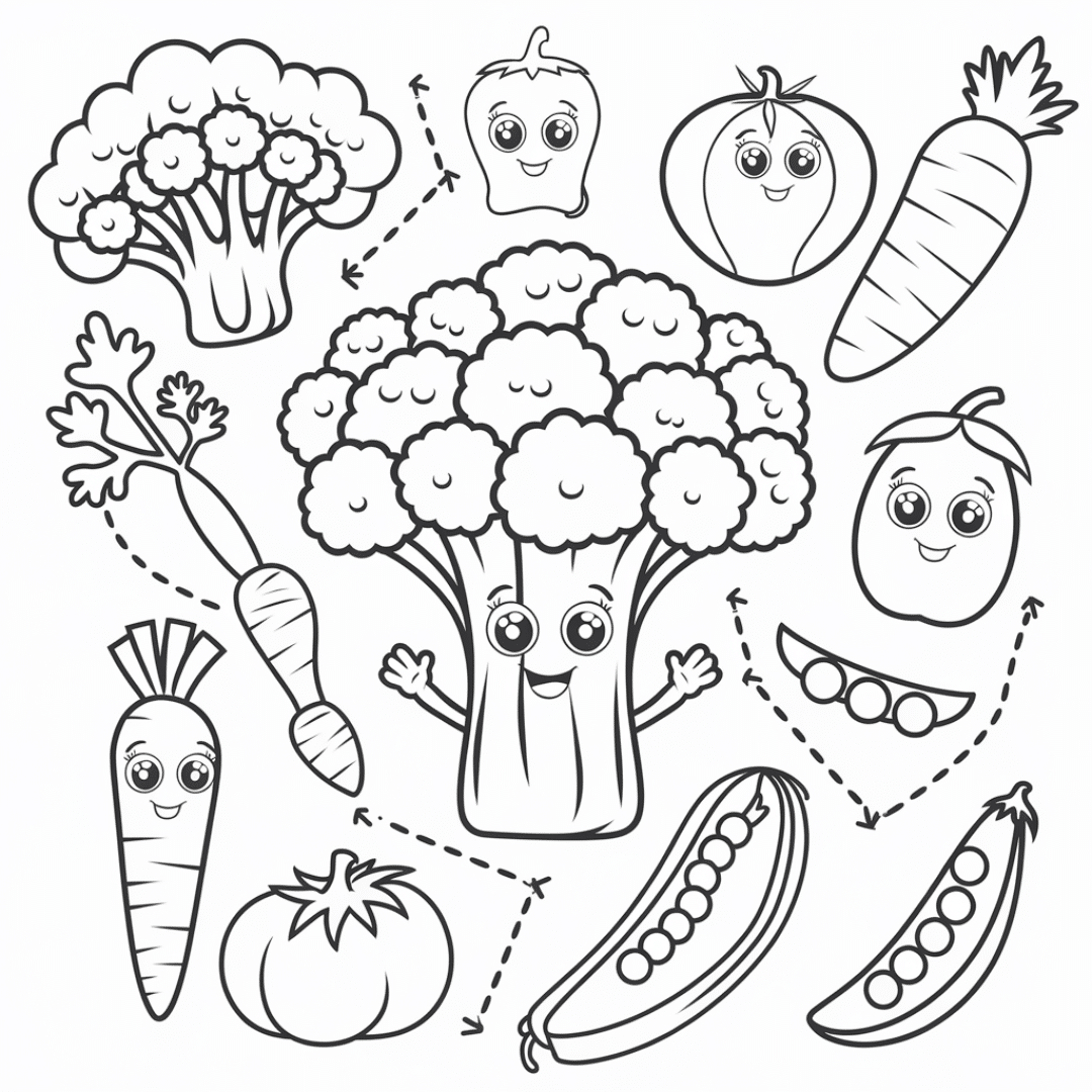 This is a page showing broccoli with its vegetable friends: carrots, tomatoes, and peas. Kids match and color similar vegetables, learning food groups naturally.